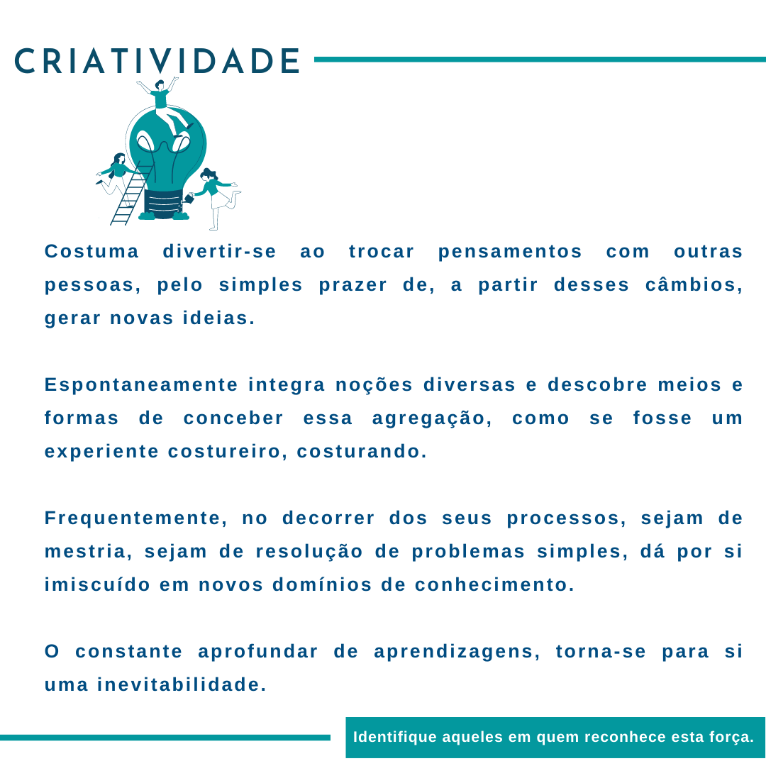 Quando focamos estes detalhes, desengane-se quem pense, numa primeira análise, que a pessoa criativa terá tendência à dispersão. Referimo-nos, concretamente, a uma constante e consecutiva integração de novas aprendizagens e conhecimentos, como resultado do processo e concepção criativos. Processo no qual a pessoa se expressa, tantas vezes num movimento de sublimação, ao mesmo tempo que faz criar em si pontos comunicantes de diferentes aprendizagens, concebendo meios e formas de materializar ideias, obras, projetos.