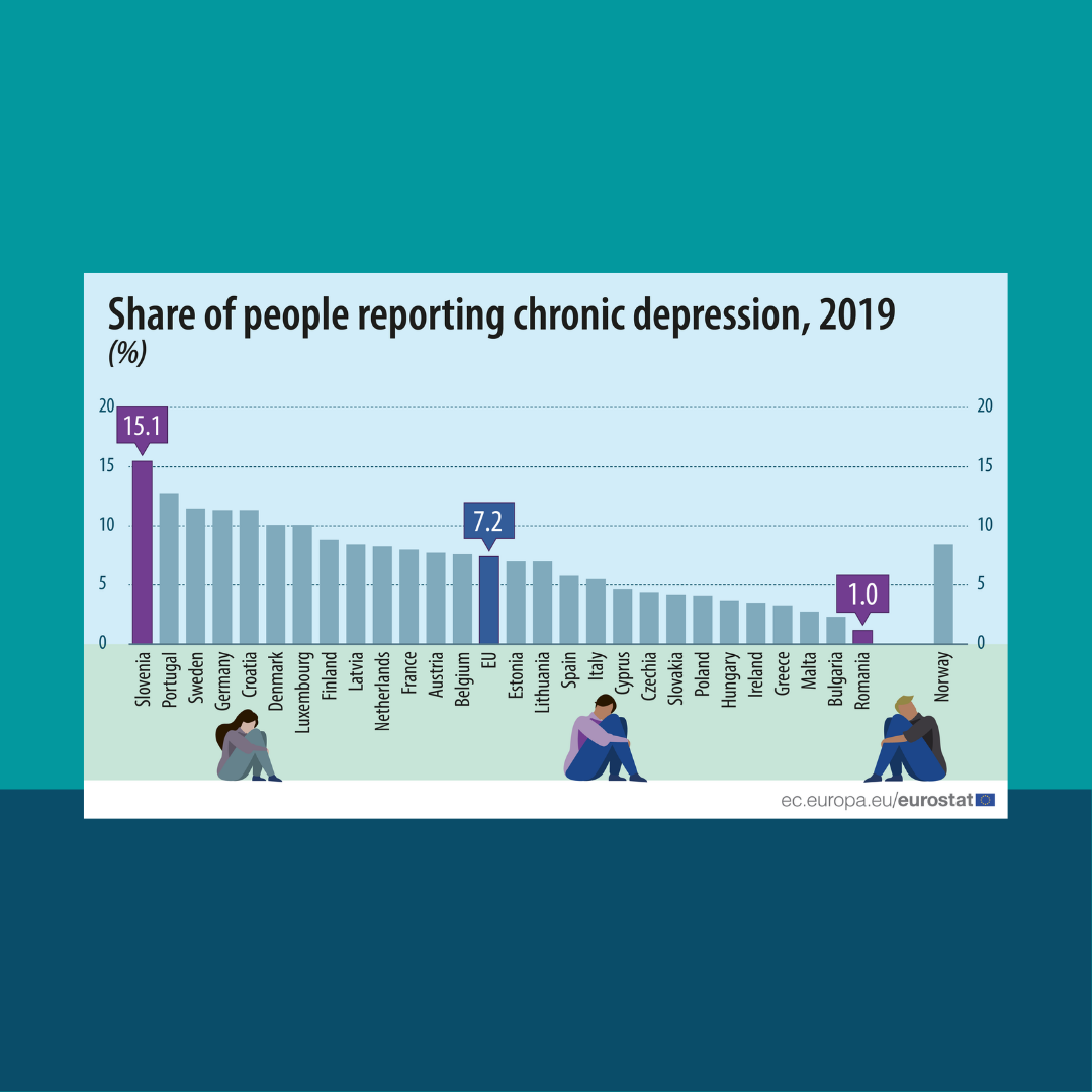 Entre os países da UE, a Eslovénia (15,1%) tinha a maior percentagem da população com queixas de depressão crónica em 2019, seguida de Portugal (12,2%) e da Suécia (11,7%).